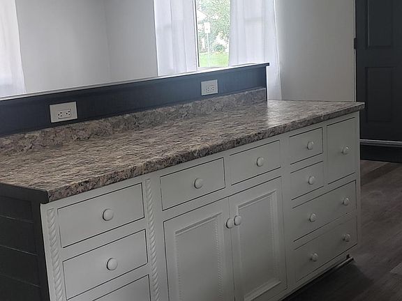 The spacious kitchen offers beautiful updated cabinets with tons of storage, black and stainless appliances and a custom island that provides additional work space and is open to entertaining your dining room and living room guests.