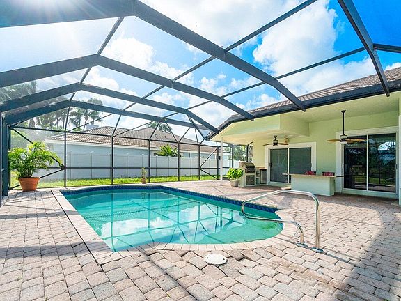 This true 4 bedroom, 3 full bath, 3 car garage pool no HOA home on a 1/4 acre lot is ready for its next owner. Features include a large paved circular driveway, two walk-in in spacious primary suite, and lots of sunlight. Resort style swimming pool enclosed by a large screen enclosure and a covered lanai with outdoor kitchen. To the North of the property in the backyard is the old Cypress Creek golf course, and future development by Toll Brothers (lake behind property is in the master plan)Split bedroom plan with the primary suite away from the living area, and three bedrooms on the opposite side of the home. Vaulted ceilings, AC from 2018, fence around property (not fenced in), and tremendous opportunity after some interior TLC/Finish work for a new homeowner.