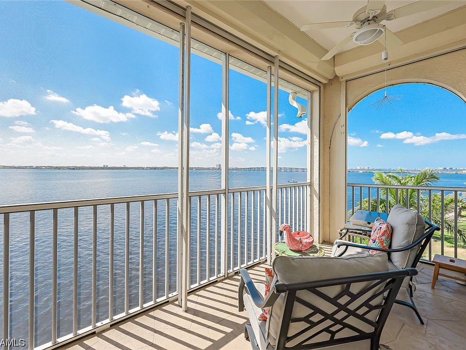 Experience waterfront luxury in this stunning RIVERFRONT, end unit penthouse. Breathtaking sunrises over the water from the living room, kitchen, and primary bedroom! Light, bright and airy w/ over 2000 square feet of total living space. Soaring vaulted ceilings in the living room and kitchen fill the rooms with natural light. Access the screened lanai through 2 sets of sliding glass doors and watch the dolphins and manatees swim by or catch a rainbow or magnificent moonrise. The kitchen is coastal inspired with grey cabinetry, granite countertops, custom glass backsplash, breakfast bar and ss appliances. Enjoy ample storage with a spacious pantry and a charming bay window in the kitchen nook which offers even more water views! Each of the 3 bedrooms are ensuite and have updated showers and granite countertops. Primary bedroom features a walk-in closet, coffer ceiling and spectacular views through a set of sliding glass doors. Electric roll-down shutters for storm protection. BOAT SLIP included. HOA offers a resort style pool and lap pool. Roof 2018 and newer elevator. Easy access to restaurants, Fort Myers and walk to Jaycee Park. Plenty of parking for you and your guests!