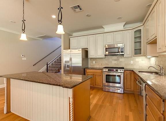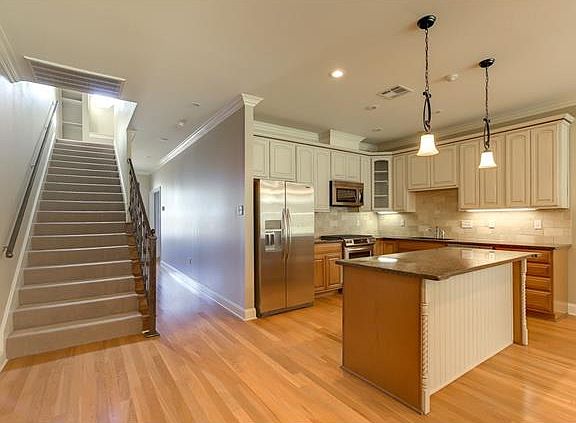Upscale Townhouse with 2,353 sq ft of living space and 2,800 sq ft under beam. Master bedroom is downstairs and has an enormous walk in closet and gorgeous master bedroom bath suite. This home has many high end upgrades like: flagstone on front porch, ironwork stairwell, wide stairs and 2 bedrooms upstairs. The nice surprise is the extra private room 10 x 10 which extends from one off the second bedroom. It can be an office, craft room or another bedroom. The appliances remain. Clean and high end.