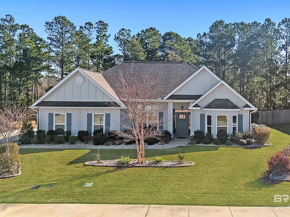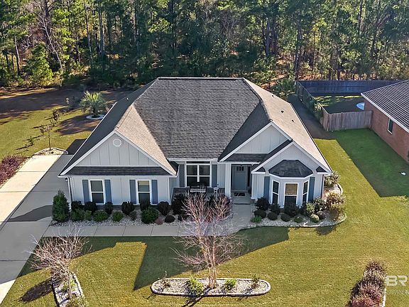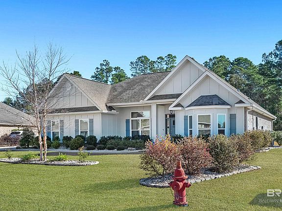 This exquisite three-bedroom, two-bathroom home in Craft Farms North boasts remarkable detailing and style. The living room/office features a spacious 12' cathedral ceiling and a bay window. The formal living room could even be converted into an extra bedroom! The dining room with an Italian, hand-blown glass chandelier has equally an impressive 12' tray ceiling, giving the home a grand and opulent feel. The family room is designed with 10' ceilings that tray to 11' and 12', providing an open and airy living space that is ideal for spending time with loved ones. The open-concept family room leads to a screened back porch and extended patio - an excellent space for outdoor entertainment or just relaxing in the fresh air. The wood floors, granite countertops, painted cabinets, and tray ceilings all come together seamlessly to create a comfortable and stylish living space that is perfect for you and your family. The kitchen offers a cozy breakfast area where you can enjoy your morning meal. The kitchen features a modern gas range, which will provide you with a fast and efficient cooking experience. The master bedroom is a true retreat, with an additional sitting/office area that opens to the screened room. The master bath is equally stunning, boasting tiled shower and floor and a massive master closet that provides ample space for all your belongings. The home is Gold Fortified and comes with a Smart Home system, providing added convenience and control over your home's security and energy efficiency. This home has BEAUTIFUL landscaping throughout the 100 ft x 150 ft lot backing the woods and has wonderful curb appeal! Additionally, the underground irrigation system on a separate meter ensures that your lawn and landscaping remain healthy throughout the year. Craft Farms North is conveniently located between Hwy 59 and Foley Beach Expressway and only 6 miles from the Gulf Shores Public Beach Access.