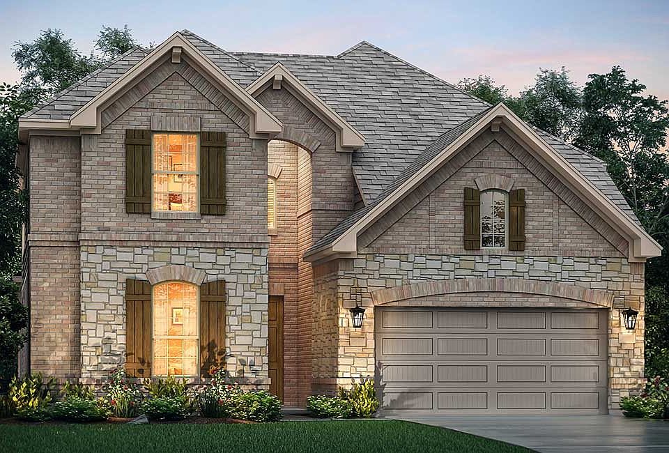 The versatile two-story Louvre floor plan by Village Builders features a unique dual living arrangement. A Home within a Home®, the private suite boasts a separate and private front entry, living room, bedroom, full bath, and a handy kitchenette. The main home features a welcoming front porch and foyer entry, an island kitchen with walk-in pantry, open dining room, walk-in utility room, a spacious family room with the option to add a corner fireplace, two car garage, and relaxing covered rear patio. The master bedroom features an en suite bathroom with dual sinks, separate shower and tub, private toilet enclosure, and a large walk-in master closet. The first floor also boasts a second full bedroom and bathroom. The second floor features two additional bedrooms, two full bathrooms, and a generous game room. The Louvre Next Gen® floor plan also offers the option to add an extended covered rear patio.
