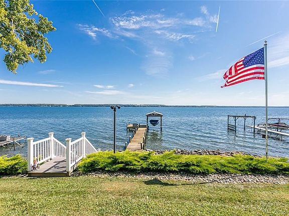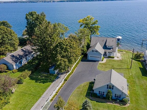 SPECTACULAR 2005 Custom built home in the heart of Finger Lakes wine country on Seneca Lake!Phenomenal Geneva Location w/city amenities, less than an hour from Rochester or Syracuse! Prime level water front w/ 80 ft Permanent Dock, Covered Electric Boat Hoist & Walk-in Lake Access.Gorgeous views from every vantage point! Main house with OPEN FLOOR PLAN & Spacious Deck perfect for entertaining.First Floor Master Ensuite. Second Level features Three bedrooms and Full Bath. Convenient Two Car Attached Garage. Over 1300 SF Two Bedroom In-law /Guest Apartment with Private Entrance, separate Furnace, A/C & laundry, patio just steps from the Lake. BONUS Outbuilding with workshop, large overhead door for boat storage and loft space above!! TRULY A ONE OF A KIND FINGER LAKES HOME OF DISTINCTION!