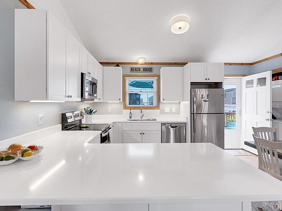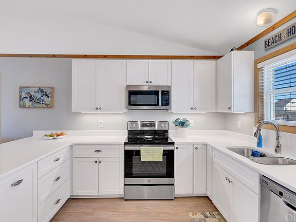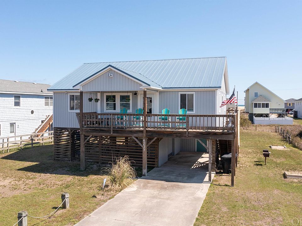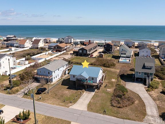Whether you’re searching for a primary residence, second home, or investment property, this updated 4-bedroom, 2-bath home in Kitty Hawk has everything you’re looking for in a beach cottage, including OCEAN VIEWS, a huge yard with lots of hangout space, and updates everywhere you look! Located just steps from the ocean and close to great local shops and restaurants, you’ll immerse yourself in the Outer Banks lifestyle in no time. The combined kitchen, living, and dining area offers coastal details with updates throughout including fresh paint and LVT flooring. The fully remodeled kitchen features beautiful hand-built custom cabinetry, quartz countertops, stainless appliances, and a peninsula with bar seating, plus you can see ocean peeks from the kitchen window! The dining area is conveniently connected to the kitchen and offers plenty of gathering space and an eye-catching new light fixture. The living area is airy and inviting, with new furniture and décor pieces accentuating the modern beach cottage feel. All four bedrooms are generously sized, with two on either side of the home, each separated by a full hall bath. Whether you’re in the mood to relax or play, there’s lots of opportunities for fun outside, with a covered front porch and a massive rear sun deck with ocean views overlooking a spacious backyard (which currently serves as a grassy volleyball court but should accommodate a pool). In the side yard, you’ll find a charcoal grill and horseshoe pit. If you’d like to create even more outdoor hangout space, you’ll find a large open area under the house where the possibilities are endless! Other outdoor conveniences include a shower and storage closet. With its functional floorplan, coastal-inspired details, updates galore, stunning views, and proximity to the beautiful beaches and amenities that Kitty Hawk has to offer, this lovingly cared for cottage will tick every box on your wish list!