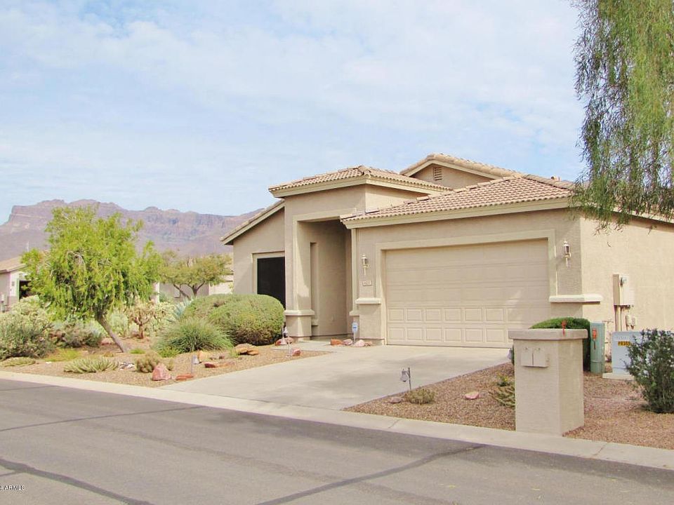 A true turn key for Sale - furniture, wall hangings, pots and pans. Pool/Spa heated by heat pump controlled inside the home. Termite control by bait traps. Inside this gorgeous home has open concept starting from leaded glass front door, carpet & tile, window treatments throughout the home, windows trimmed out w/wood.Hunter Douglas window blinds, granite & hickory wood cabinets, master bedroom with king sized bed,garden tub and separate shower. Newer water heater, water softener & RO.Also office/den to add to this one of kind, well maintained, gently used home. The views of the Superstition Mountain are exciting and no golf balls. Cornet lot with common area to the side and back of home.Home warranty comes with this 1 ST CLASS home.