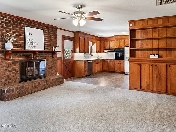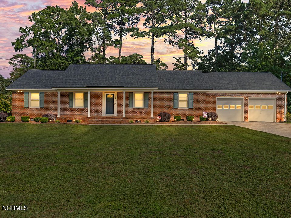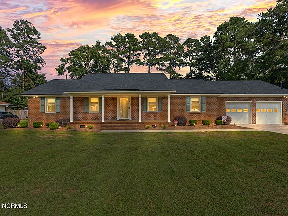 This charming brick ranch home offers exceptional curb appeal on over half an acre. The primary bedroom features an en-suite bath and generous closet space. The kitchen provides plenty of storage, a built-in oven, granite countertops, and a large sink. The spacious living room showcases a beautiful brick fireplace, accompanied by a formal living room, dining room, two additional bedrooms, and a full bath with double sinks. Outdoor features include a welcoming front porch, patio, and expansive yard, ideal for entertaining. A 2-car garage and ample storage complete this well-maintained property in Ayden, NC.