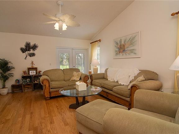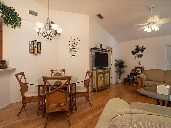 Move right into this lovely three bedroom home centrally located in The Tree Tops with a beautiful water view. Relax in your covered screened in lanai area, or enjoy in your hot tub and overlooking the water. All the work and updates have been done for you: roof, toilets, doors, windows, appliances, air conditioner, hardwood floors, sinks, driveway and sprinkler, along with a water filter for the home. The pet friendly community offers a heated pool, tennis court, along with cable and internet, that is included in the HOA fees. Show today and make this your next sale.