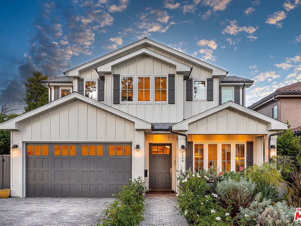 Luxurious 2017 Cape Cod Estate in desirable Studio City neighborhood. Conveniently located in the Coveted Carpenter School district. Just under 3,900 square feet, this five-bedroom, five-and-a-half bathroom home is finished with warm expensive wood floors, high ceilings, and custom sliding glass doors allowing for a bright, open layout throughout. The bright and spacious kitchen features a large center island, equipped with stainless steel appliances, and opens up to the living room. A butler's pantry through the kitchen brings us to an elegant dining room with custom light fixtures and plenty of room to host. Just off the family room, a pocket sliding doors open up to a private backyard with a large pool and spa, built-in barbecue, and custom waterfalls flowing into the pool. The master suite showcase high ceilings, a fireplace, gorgeous master bath completed marble and brass finishes. ample closet space, and a standing tub. This home is centrally located.