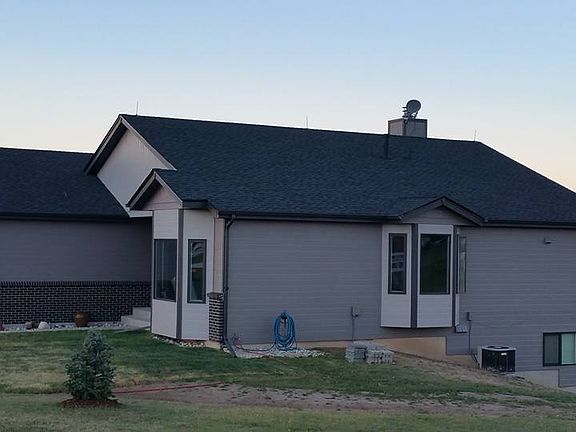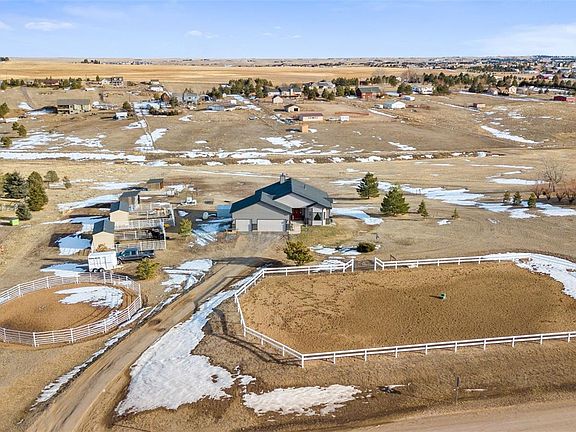 Ranch style home situated on over four acres with stunning views is a horse lovers dream! Large arena, round pen, paddocks (with Loafing shed), chicken coop and more! Pride of ownership evident as you enter through the foyer into the inviting family room with brick fireplace. Expansive views from the large window will allow you to watch the animals or marvel at the sunrises and rainbows! The family room flows into the kitchen, which boasts wood flooring, newer Whirlpool stainless appliances and roll out shelves! A large bay window in the dining room or the front window from the sunken living room will afford amazing sunset views! The walk-out basement features high ceilings, a large open area, fireplace, wet bar and two large bedrooms (or home offices!). Newer roof, paint, basement carpet & windows (Milgard low-E). Bridle path and horse trails throughout subdivision. Enjoy the peace and serenity of country living but still appreciate an easy commute to Southlands, Parker or Elizabeth.