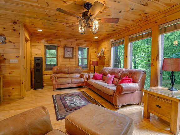 Projected to do 40-45k on overnight rental!! This GORGEOUS upscale cabin is situated in a private wooded setting, but conveniently located just minutes from the Arts and Crafts Community of Gatlinburg, Dollywood, shopping, dining and more! This 2 bedroom/2.5 bath cabin has lots of windows, 3 gas fireplaces, tongue and groove, hardwood floors, 2 huge master en suites with sitting areas, large living room with floor to ceiling windows, fireplace, flat screen TVs, new leather living room furniture, fully furnished kitchen, bar seating, custom cabinets, black appliances, nice dining area surrounded by windows, all new decor, new hot tub, new deck lighting, new Atari Video Game, screened porch, large grill, outdoor furniture and much more! Turn key, must see!!