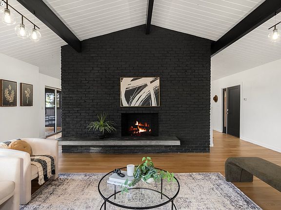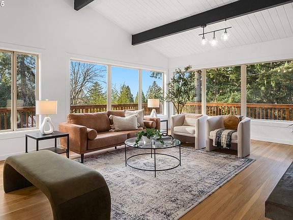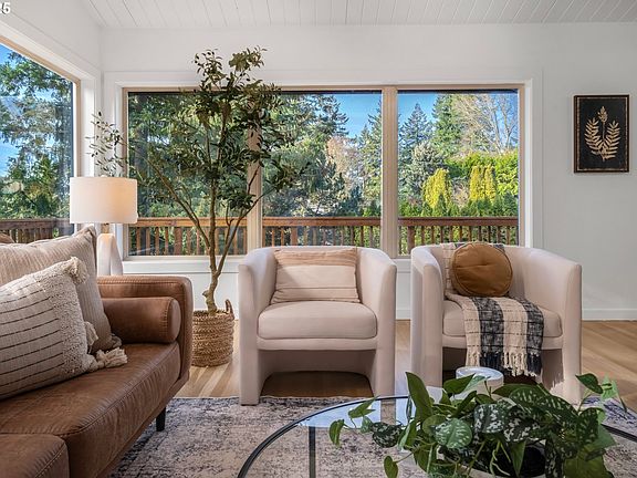 Step into this completely renovated 1958 Mid-Century Modern dream home located in the coveted Bridlemile / West Hills. With a spacious and inviting layout, this home blends timeless design with modern updates.The main level welcomes you with original, beautifully refinished hardwood floors, vaulted wood tongue-and-groove ceilings, exposed beams, and an abundance of natural light streaming through the expansive SW-facing wall of windows. The stunning wood-burning fireplace with a brick surround and concrete bench seating serves as a striking focal point in the living room.The chef’s kitchen has been thoughtfully transformed with custom cabinetry, quartz countertops, and stainless steel appliances, including a gas range. Open to the dining area, this bright and cozy space is perfect for daily living or entertaining. Features like skylights, a sliding glass door to the refinished wraparound deck, and modern finishes complete the main floor.The primary bedroom is conveniently located on the main level with a walk-in closet and adjacent stunning full bathroom. Two additional bedrooms and a beautiful full bath on the main level.The lower daylight level offers another spacious living area with a fireplace, large windows, and backyard access. It also includes two more bedrooms, a beautifully designed full bathroom with a walk-in shower, and a large laundry room.The gorgeous yard features a tranquil retreat with lush landscaping and even a basketball court! Located in a desirable, quiet SW Hillsdale neighborhood, this home is minutes from Hillsdale, local shops, restaurants, downtown, Council Crest, OHSU, and Nike.Some major updates include: New roof, sewer line, plumbing, lighting, new finishes throughout the entire home, appliances, water heater, landscapingDon’t miss this one-of-a-kind opportunity to own a true Mid-Century Modern gem. Schedule your private showing today!