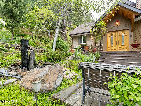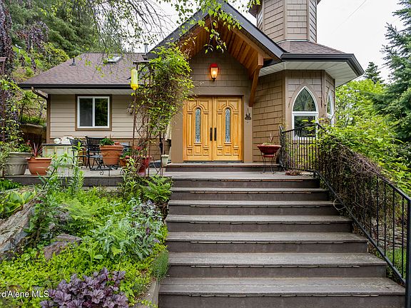 Custom! This home is completely tailored from top to bottom. Upon entry, enjoy the hand-built front doors and experience the vaulted ceiling, custom cathedral windows, skylights and commissioned concrete floors infused with radiant heating. The open floor plan invites entertaining of the most fabulous sort! The custom kitchen and pantry designed by an award-winning French Chef integrate beautifully with the dining spaces and living room. The primary bedroom with on-suite bathroom, boasts luxury with a jetted tub over looking the forest, heated towel rack, walk-in shower and lit mirror. The custom Murphy bed in the second bedroom offers unmatched flexibility. Main floor laundry, patio space and designated office space add ease. Bonus attic space, heated floor double garage, and sprinkler systems for the incredibly landscaped garden and patio spaces are just a few more of the well-designed highlights. You have got to see this repurposed church that checks all the boxes, plus some.