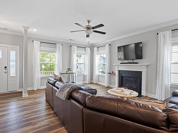 This beautiful 4 bedroom, 3 bath home combines style and function with modern design features, as well as cost-saving solar panels. You'll appreciate the LVP flooring, crown molding, modern paint colors, and the open floor plan. The oversized kitchen features quartz countertops, grey cabinets, a center island, and stainless steel appliances. The downstairs bedroom, along with the full bathroom, is ideal for guests or extended family. Upstairs, the primary suite is a private retreat, with an oversized sitting area and ensuite bathroom. Two additional bedrooms upstairs, as well as a cozy loft, provide space for everyone. Enjoy outdoor living in the fenced backyard, along with a patio which is perfect for relaxing or entertaining. The home's prime location, close to schools, highways, shopping, and medical offices, provides additional convenience. Holly Pointe is an active community with an HOA and swimming pool.