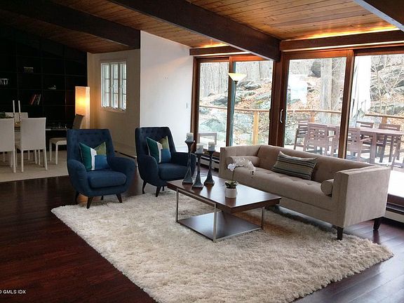 Newly renovated sophisticated, contemporary style home, set back from road on private 2.38 lush, wooded acres, secluded yet only 11 minutes to train and downtown and a five minute walk to the adjacent Mianus River Park. Rental comes with access to seasonal Park/Beach passes to Greenwich Point, Byram Park, Island beach and Great Captain Island. Open floor plan, flooded by light, vaulted ceilings, floor to ceiling windows, skylights and wrap around deck, put you in touch with the natural surroundings. Large lower level suite with fireplace, 2 bedrooms, 2 baths and private entrance, possible professional(office) space, media room, library, play room and guest quarters.