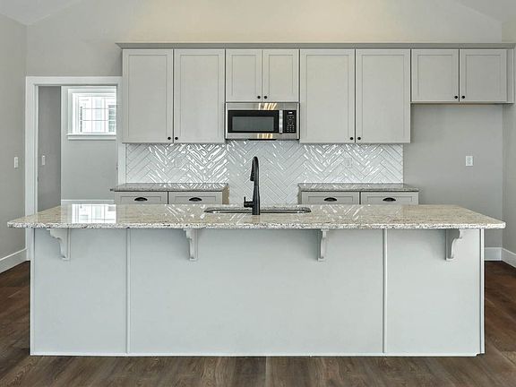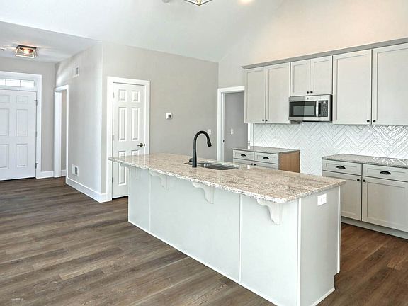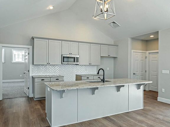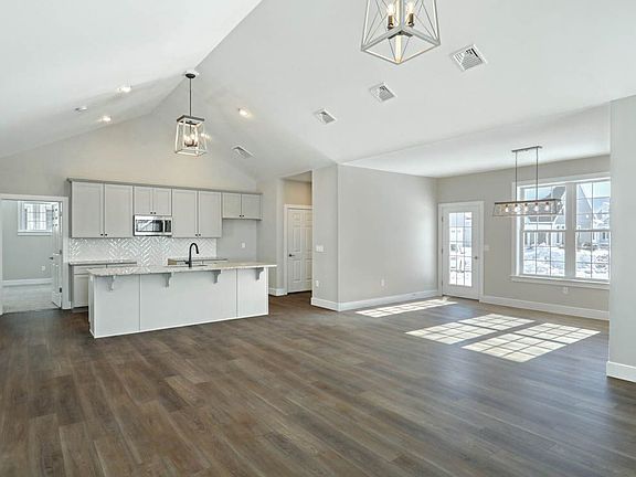 This craftsman style home in the 55+ community of Home Towne Square includes a welcoming front porch, lofty 9' ceilings, and a 2-car rear load garage with entry. To the front of the home is a study. Stylish vinyl plank flooring extends to the main living areas. The kitchen includes granite countertops with tile backsplash, crown molding, and attractive cabinetry. The living room with a cathedral ceiling features a cozy electric fireplace featuring shiplap and a box beam mantel. The dining area provides access to the patio. The owner's suite includes a private bathroom with double bowl vanity, 5' tile shower, and oversized closet.