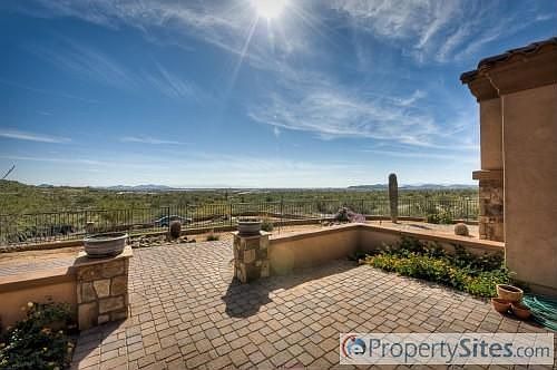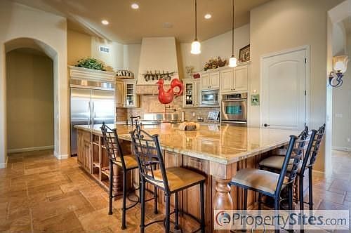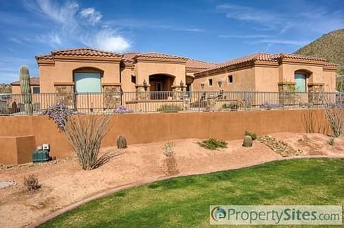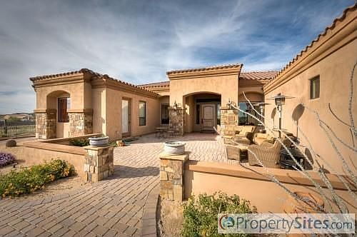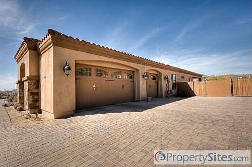 Complete info: http://424eyearling.ePropertySites.com - Amazing sunsets from newer custom home on 1.3 acres. 4008 square feet in main house featuring 5 bedrooms and 4.5 bathrooms and 3 car garage with 8' garage doors, 1300 square foot guest quarters offering 1 bedroom and a bath with a full kitchen above the detached 45' x 30' 4 car garage. Main house has 5 piece side pattern travertine throughout with carpet in bedrooms. Large stainless and granite kitchen opens to family room and eat-in kitchen. Separate living and dining rooms off foyer. Full paver driveway and walkways in front with extensive stone work on all sides. Pebble finish pool in back with water features and built in BBQ with fireplace. East side of home has sport court and childrens play area.