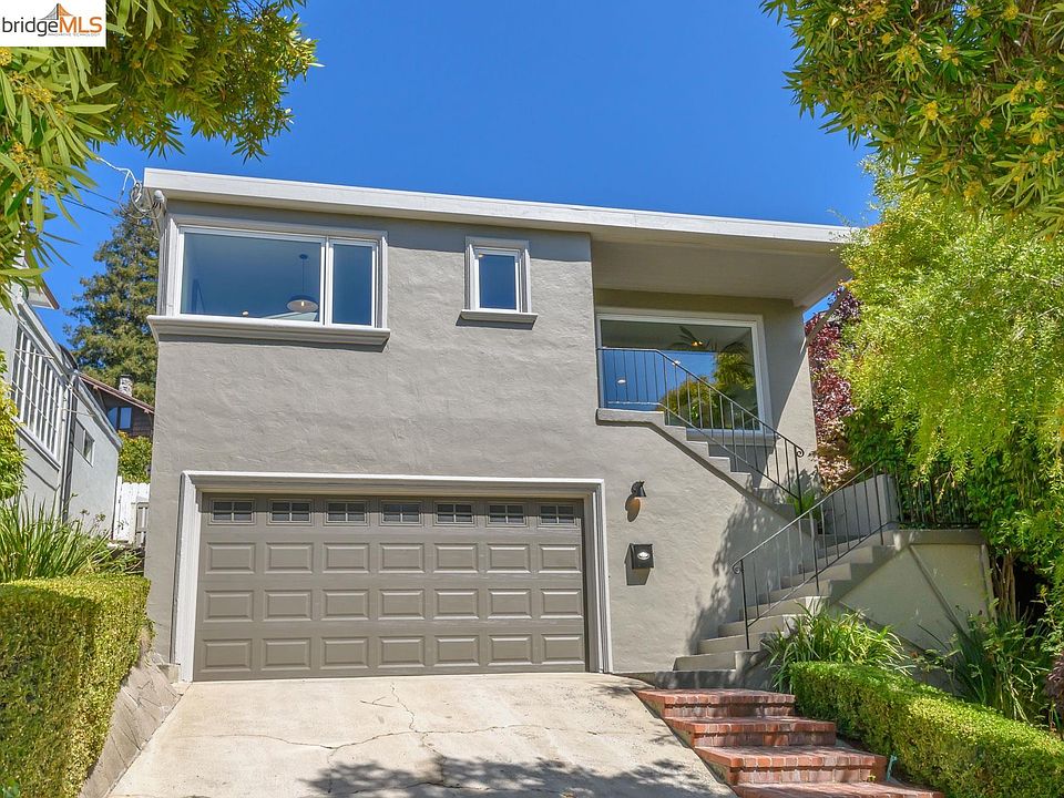 This mid-century three bedroom, two baths with a new permitted primary bath is now positively modern. Just updated three-bedroom, two-bathroom home with open layout, plus lower-level family room, exudes bright sophistication. Myriad skylights illuminate clean-lined, hardwood-floored spaces throughout. Over the quartz-clad kitchen, a vaulted ceiling inset with elongated skylights enlivens a lavishly large island that invites gathering. Grand picture windows from living and dining expanses frame treetop and long-range skyline outlooks. Both the wide-stretched kitchen and primary suite connect to the exterior, where a flagstone terrace extends from the home, and level lawn outlined by manicured garden gushes with perennials, including roses, and trees, citrus and fig, among many. The primary suite takes in this view via sliding glass doors, and its skylighted bathroom, freshly renovated, combines new components and a soothing matte-finish tile scheme. Comforts and conveniences abound: central air conditioning, attached two-car garage with workbench, idyllic walkability to Piedmont schools and sports complex. It's air conditioned!