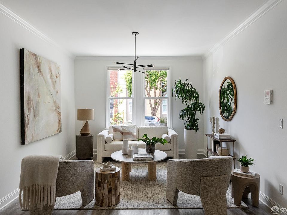 This chic North Beach residence boasts two bedrooms plus a flexible den ideal for a home office and/or nursery and two full baths. The functional floor plan features an open living and dining area that seamlessly flow into the renovation kitchen. The thoughtfully designed kitchen offers ample white shaker cabinets, stainless steel appliances, gas Bertazzoni range, pot filler, wine fridge, quartz countertops, and a classic Carrara marble tiled backsplash. Two sizable bedrooms are positioned in the rear of the property providing restful spaces. The primary bedroom benefits from a walk-in closet and en-suite bath complete with a shower over tub and additional linen closet. The second bedroom has a sizable closet. In unit laundry, abundant closets with custom Elfa systems, approximately 295+/- square feet of additional storage, and a private patio complete this offering. Ideally positioned between restaurants/shops along Columbus Avenue, Washington Square, Fisherman's Wharf, and the Embarcadero.