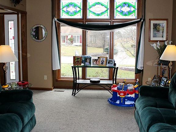 OPEN HOUSE SUNDAY FEB 25th from 1-4! Picture perfect 2 story on a basement within walking distance of the elementary school. This VERY well maintained home has great curb appeal from the grey exterior color scape to the professionally landscaped front and back yards. The welcoming front porch and double stained glass side lites usher you into a formal foyer with wood floors. The formal living room has plenty of sunlight coming in through the triple window with a triple transom. The real stained glass in the transoms can be removed if this is not to your taste. The living room flows into the dining room, which is currently used as a den. The kitchen has ceramic floors, nice cabinetry, Corian counters with a built in sink and a tile back splash. The high end stainless steel Maytag appliances will remain; a 5 burner gas stove, French door refrigerator with mini drawer and bottom freezer and sleek dishwasher. The floor plan is open across the back of the home and provides nice back yard views. The fact that there is a commons area behind this home so your fenced in back yard looks even bigger than it is. The breakfast room (or nook) has a new fiberglass slider and 2 windows on each side that bring in the sun shine. Off the nook is a 20 x 14 stamped concrete patio that is wonderful for entertaining or just back yard sitting. The family room is warm and cozy (NOT SMALL) with the gas log fireplace, low brick hearth and custom shelving but, don't worry the triple window brings in the light. Upstairs you will find 3 additional nice sized bedrooms, all with ceiling/fan lights and nice closet space. There is a main bath that has ceramic flooring and a newer one piece vanity bowl with a linen closet in the hall. The master ensuite at the end of the hall has a bedroom foyer with separate entrances for the sleeping area, the closet and the bathroom. The master bath has heated ceramic floors, a newer double sink one piece vanity top, a jetted corner tub and a separate 4 foot shower. In the lower level you will find a rec room, a 2nd rec room with a nice bar top and a 8 x 10 storage closet. The mechanical room is very generous and offers even more storage. The oversized garage will give you plenty of room for all those extras. The driveway is sized for a 3 car garage so there will be plenty of parking.