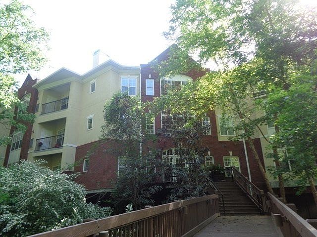 Tucked among lush Georgia greenery, this gated condo complex is a hidden gem just off Peachtree! With a lobby that will impress your guests, this sophisticated first floor unit has an unbelievable amount of private outdoor space for a city location! See the pics! Gorgeous hardwoods with perfect roommate setup-each bed in its own wing, each with private bath. Master suite has oversized jetted tub and walk-out to patio. Nice neutral colors. One garage parking space and storage unit included. Washer, dryer, refrig included. Community pool too! No pets please.