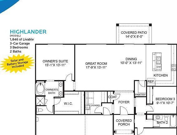 The Highlander at The Traditions at Mountain Gate is masterfully designed for energy efficiency, comfort, and longevity. Every detail of this 1,846 square foot floor plan has been thoughtfully considered. The spacious Great Room is perfect for get-togethers and connects to the patio with a variety of sliding door options. There are plenty of design options to make Highlander your own, from a ideally appointed gourmet kitchen, to the tile in the roomy owner's bath. The Highlander starts at 1,846 square feet, 3 bedrooms, 2 baths, with a 3 car garage.This Highlander floor plan comes with solar and sonnen energy storage standard.