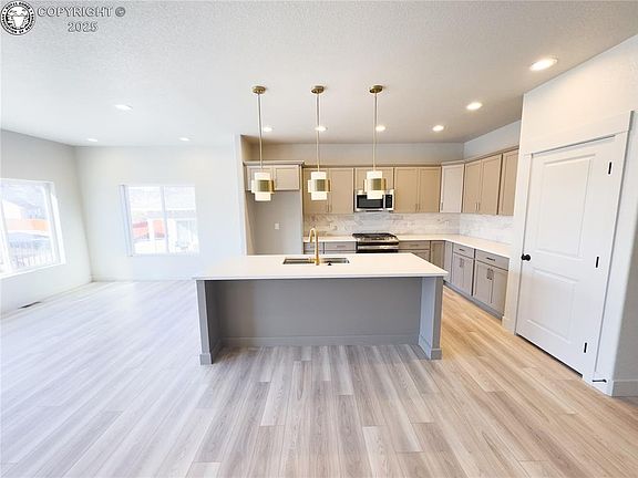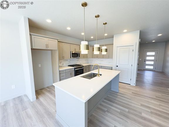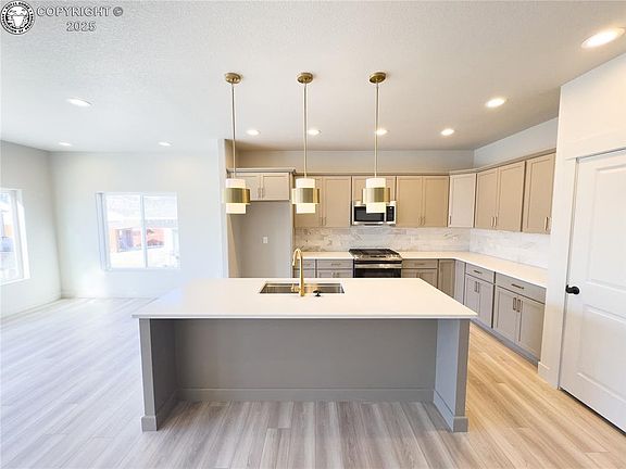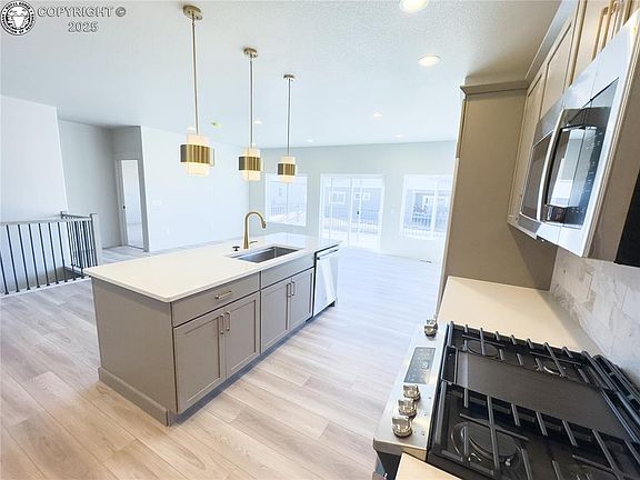 This modern new 4-bedroom ranch-style home is located in Southwest Canon City. The “Katie” is one of our most popular floor plans, offering the perfect blend of main-level living, luxurious finishes, and a fully finished basement. From the inviting covered front porch, step into the great room, the heart of the home. Large windows flood the space with natural light, creating a warm and welcoming atmosphere ideal for relaxing with family or entertaining guests. The adjoining kitchen is a chef’s dream, featuring upgraded dark cabinetry, white quartz countertops, and a five-burner gas range. A large center island with counter seating, custom pendant lighting, task lighting, and a spacious pantry ensure this kitchen is both stylish and functional. The kitchen seamlessly connects to the dining area, making it perfect for hosting dinner parties or enjoying everyday meals. The luxurious primary suite serves as a tranquil retreat, complete with a cozy sitting area to take in scenic views. The spa-inspired en-suite bathroom features a custom dual vanity, a glass-enclosed shower, and convenient proximity to the nearby laundry room. A second main-level bedroom and a beautifully designed full bath complete the main floor. A central open staircase leads to the fully finished basement, which adds two additional bedrooms, a shared three-quarter bath, and ample storage space. Every room in this home reflects meticulous craftsmanship and thoughtful design details. Central air conditioning ensures comfort year-round, making this home an exceptional retreat in any season. Located just 45 minutes from Colorado Springs in Fremont County, this home offers more than just comfort—it’s surrounded by breathtaking scenery, mild weather, and unparalleled outdoor recreation.