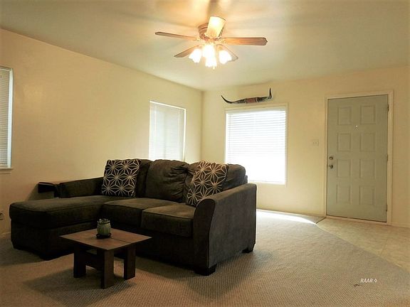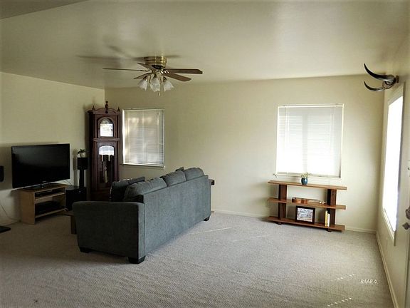 This Downtowner features a green lawn and fenced front yard. Newer energy efficient windows! This two bedroom home has a breezeway that was converted into a second bedroom. Spacious kitchen with formica countertops. Large carpeted living room with ceiling fan and plenty of natural light. Hallway full of storage cabinets. Master bedroom has two closets and built in chest of drawers. Large backyard with covered patio. Workshop off of the back of the garage/back porch with a heater and A/C unit.