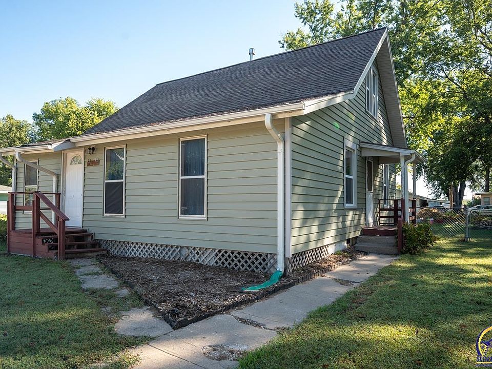 Discover your dream home in beautiful small-town Kansas! This lovely 3-bedroom, 1-bath residence boasts a variety of modern upgrades while retaining its classic charm. Features: Exterior Upgrades: New vinyl siding and durable 50-year Malarkey shingles. Updated Utilities: New sewer and water lines ensure peace of mind. Interior Highlights: Gorgeous hardwood floors, a stylish new shiplap ceiling, and custom kitchen cabinets that add character. Living Space Improvements: Freshly updated living room ceiling and flooring in both the kitchen and living room for a cozy feel. Basement: With addition of a egress window on the SW corner of the basement you could easily add a 4th bedroom! Comfort & Convenience: Brand new water heater. Outdoor Space: Enjoy entertaining in the spacious, fenced-in backyard, perfect for gatherings and play. New custom built storage shed/building Don’t miss your chance to own a piece of small-town charm! Schedule a showing today!