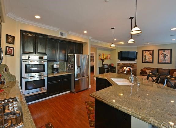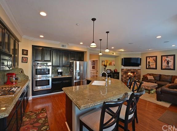 Beautiful Single Family Home in highly sought after Alta Vista South community. This William Lyon home features 2790 square feet with 4 bedrooms plus office and 3 full bathrooms. A wonderful floorplan with office and bedroom downstairs. This gorgeous home comes with amazing upgrades and amenities including: designer kitchen with granite countertops, large island, dark cabinets, stainless steel appliances and newer pendant lighting, family room with ledgestone gas fireplace, all three bathrooms are beautifully upgraded with travertine floors and showers, marble countertops(two) and newer fixtures, hardwood floors, designer carpet, crown molding and upgraded baseboards, window blinds, ceiling fans, spacious backyard perfect for entertaining with built in BBQ and beautiful bar and large grass area, mountain, city light and hill views from master and backyard, garage features three professional overhead racks for storage, association pool and spa with low HOA and no mello roos.