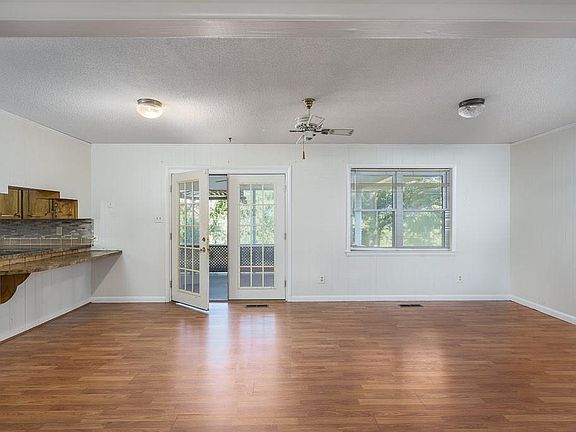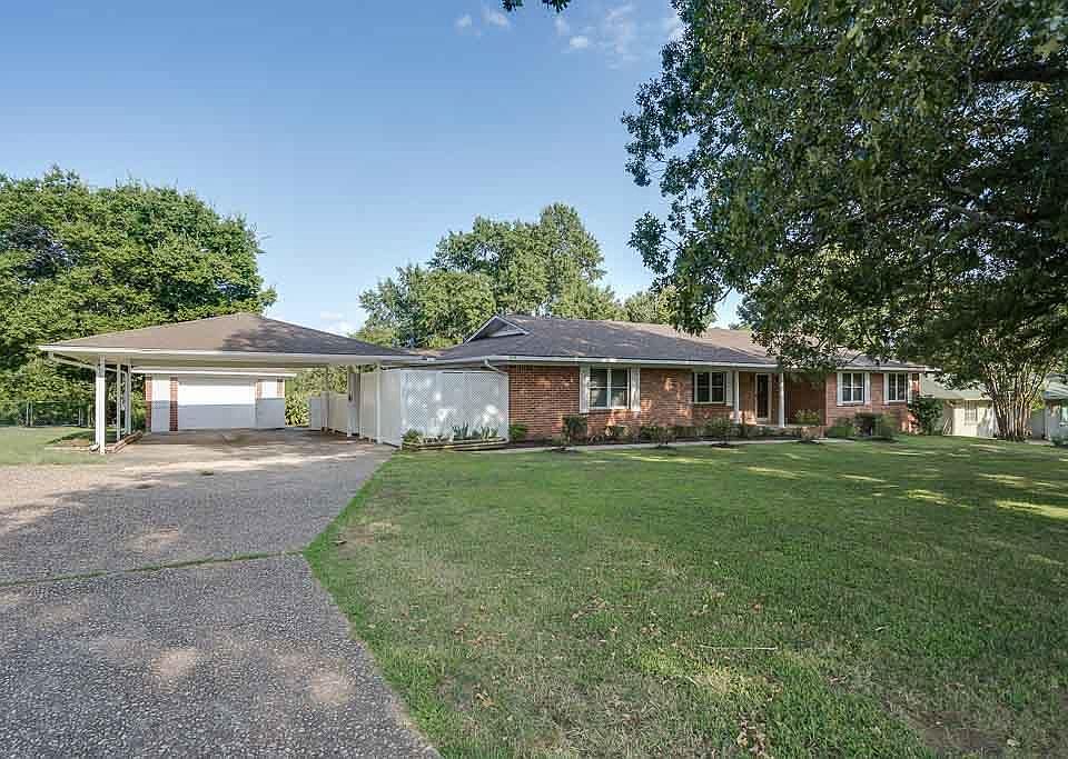 Acreage in town! 4 bedroom, 2 bath brick home with 4 yr. old arch. roof, new vinyl windows, covered deck, porch, 2 car carport, detached 1 car garage/workshop, 40x40 chicken house or small barn, fenced, cross fenced. Lots of new paint, all tile & wood laminate flooring. 2 living areas.