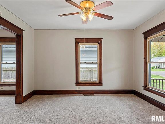 Here you'll be welcomed by a large, inviting front porch that opens into a spacious living room with brand new carpet stretching through the entire home excluding the kitchen. Large windows, warm wood trim & neutral color tones flow into the formal dining room, creating a charming and cohesive space to dine & entertain. The kitchen features loads of quality wood cabinetry, modern appliances plus it's equipped with a generous dine-in area, with main floor laundry conveniently nearby. Find two spacious bedrooms on the main floor while the finished upper level serves as the generous primary suite with built-ins & more plush, neutral carpet to enjoy. The full basement adds great storage & potential, while an oversized 2-car detached garage sits pretty in the large, privacy-fenced backyard offering multiple patio spaces to enjoy. Nestled in a small rural community setting just outside of Springfield and in the highly desired Auburn school district, this home offers a cohesive layout, great outdoor space & the kind of comfort that just feels like home!