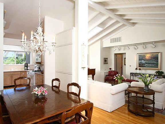 Instantly captivating this home has all the right details! The spacious master bedroom with fireplace, a walk in closet,wood floors and french doors opening to the yard is light and bright. The living room and dining room have beautiful wood floors which are accentuated by high white wood beamed ceilings. The entire upstairs is devoted to a wonderful family room with built ins and fireplace plus a 400 sq ft deck with ocean views.A delightful garden room, beautiful front yard landscaping w/stunning African tulip tree,corner location, skylights throughout,an easy maintenance yard and LOTS of storage and closet space complete this wonderful home. Just across the street is beach access. Simply divine! Seller will entertain offers between $1,700,000 & $1,900,876.