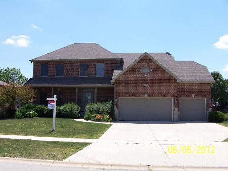 Wonderful 4BR/2.1BA custom built home with curb appeal to spare! Brick front with covered front porch, 3-car garage and leaded glass entry door, sidelights and transom. Large formal living room, formal dining room with detailed trim work. Large eat-in kitchen with custom cabinetry with crown, center island, solid surface countertops and sliding glass door to the backyard. Soaring two-story family room with bay window and floor-to-ceiling brick & stone gas log fireplace. Convenient main floor laundry and powder room with pedestal sink. Generous bedroom sizes including the master suite with cathedral ceiling, walk-in closets and luxury bath with whirlpool tub and separate shower. Full deep pour basement with rough-in for bath. A lot of luxury for the money here! --- Updated : 2012-06-17