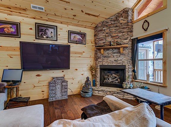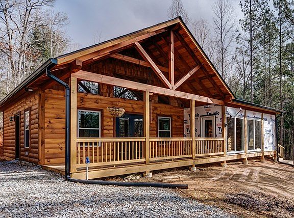 Up a Beautiful Winding Paved Road you ll find this better-than-brand-new log sided delight! Gorgeous wooded setting with large deck and fire pit that will make for some great entertaining and R&R. Settle in and enjoy the serenity, fresh air and tranquility from your open deck. Wood ceiling, wall, floors, granite countertops, stainless appliances give this open floor plan cabin ambience with a modern touch. Stone fireplace is perfect for pleasure and warmth. Master suite is pure pampering with massive tile decor shower plus French door access to bright, airy sunroom with double glass doors for outside viewing. Full size laundry room, guest bed and bath that make it a dream come true!