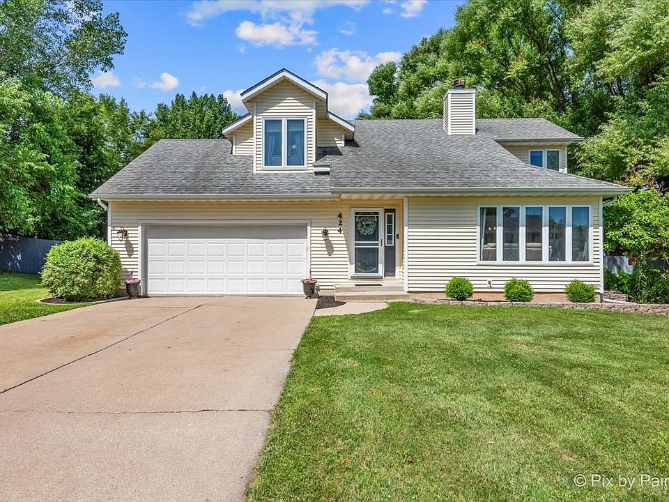 Welcome to 424 Wayne Rd. in Rochelle. This special home situated just right on an oversized lot is one of the most private lots around. Neighbors are set back and private property on the other side. Dramatic vaulted ceilings as you step in this home. Wood Laminate floors throughout the main level. The living room boasts big picture windows allowing natural light and picturesque views of the neighborhood. The brick fireplace with gas logs ties the room together. Through the living room is the formal dining room- perfect for entertaining. Open to the kitchen and slider doors that lead to the backyard. The Kitchen has been updated with oak cabinets that have been painted white with contrasting pulls and stainless steel appliances (2021). Plenty of storage with an additional pantry this kitchen is truly the heart of the home. Main floor laundry is shared with the main floor powder room is just right off the garage. Upstairs you will find the primary suite with a large window with striking ceiling - a walk in closed and en suite finish out this space. 2 additional bedrooms and a full hall bath complete the 2nd level of this home. In the finished basement is a perfect area for a play room/ rec room/game room. So many options! An additional bedroom space too! There is a second half bath for convenience. Under the stair storage room does not disappoint. The backyard is one of the best features about this home. Fully fenced and BEAUTIFUL brick paver patio with custom under lighting programed to automatically illuminate at dark. Spend hours next to the fire pit or in the mulched play area! There is a large shed at the back of the yard for extra toys as well. Power in the yard for a future pool has already been ran. Sellers added a useful door that leads straight to the garage from back yard. This home will not disappoint. Sellers have taken excellent care and added many things to home to make living here an breeze.