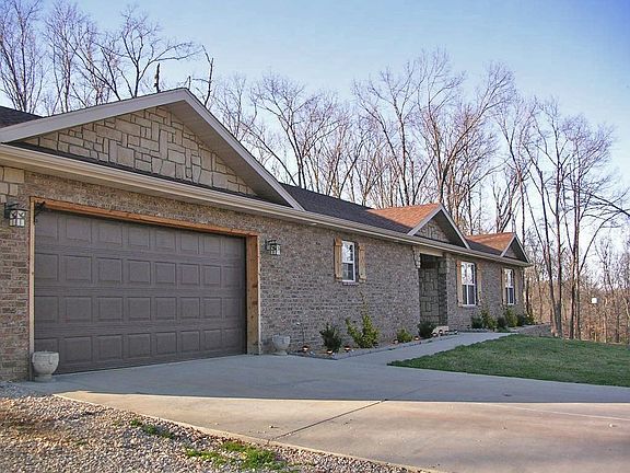 Private secluded setting for this hilltop all brick home with near 3700sq.ft. overlooking valley, pasture and woods. Peaceful, quiet, great parcel of near 25 acres for livestock, or just recreational enjoyment. Home was custom built with all very large rooms. Safe home is set into the hillside, protecting from storms. Outdoor entertainment area with pergoda, fire pit, sitting areas. The additional 3 car workshop building is custom built with many extra features with heat, electric and 1440 sq.ft. Home has high efficiency heat and cooling with very low utility bills.There are 4 alternate sources for heating. Family room can also be a safe room, or 4th bedroom. Dream kitchen is est 18 x 38 with full walls of cabinetry, large pantry, lots of counter space and super layout for cooking, entertaining. Dramatic entry with columns, arches and much detail to woodworking, flooring and windows. There is also a wet weather creek and pond on the property, with trails through the woods.