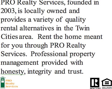 Free October Rent!! Awesome 2 Bedroom with Water & Trash Included with Rent! **Rent Special: Free October Rent Check out this amazing 2 bedroom condo with your very own laundry in the unit! Also enjoy the convenience of having a dishwasher and 1 stall garage! Water, Trash and lawn care included with rent! Cozy up to the fireplace this winter with a good book or invite friends over to watch a movie in the separate family room! Call Darcy with PRO Realty Services at 612-547-9818 with questions or to schedule a showing! Utilites paid by resident: Gas, Electric, Cable & Telephone. Qualifications: Max Occupants: 4 people. Must have satisfactory rental history, must pass criminal history background check and must have documented income of 2.5 times the monthly rent. No evictions. Section 8 not accepted. Pets are subject to approval.