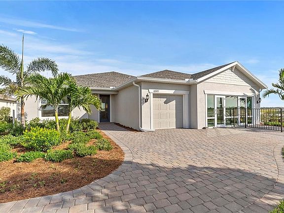 MODEL HOME AVAILABLE FOR PURCHASE in the heart of Babcock Ranch. This stunning Stardom 3-bedroom, 2.5-bathroom residence is a model home and has breathtaking lake views, providing a serene backdrop to everyday life. Step inside and discover a well thought out layout that seamlessly blends modern living with classic charm. The spacious living room is open to the kitchen and features beautiful tray ceilings. Keep it cozy, or utilize the sliding pocket doors to connect your living space to the screened in lanai with a pool and spa, creating an inviting atmosphere for family gatherings or for guests to enjoy. The kitchen is a chef's delight with KitchenAid cooktop and gas oven, built in appliances, quartz countertops, and beverage station, convenient for hosting or for extra countertop/cabinet space. Enjoy morning coffee from the inside, or step out onto the lanai overlooking the stunning water views. The master bedroom is a true retreat, complete with a spacious ensuite bathroom & walk-in closet. Additional two bedrooms are ideal for a growing family or guests, offering comfort & style. Additional features include an enclosed flex room, 3-car garage, and more! Furniture price: $22,968