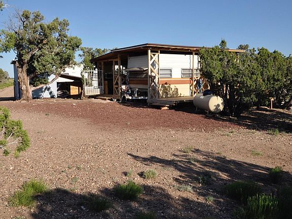 5.28 acres, private and pretty. Set up sort of like an elaborate camp site, completely livable while establishing a more permanent residence. Two older travel trailers, in good condition, with decks, & a site built addition & roof over one, Power through new 4K gas generator, with some solar equipment conveying. 1300 gal water holding tank, enclosed inside 8 x 12 shed to haul or have water delivered to. 8 x 20 steel Conex container, deck/look out on top of, and 8 x 12 man cave, with power/heat, built off one end, and shower room off other. All structures surrounded by well built 2x4 horse fencing, about 1/4 ac, keeping the dogs in. Homes accessed via winding through the trees, graveled, driveway. Public power near. Appointment only, call for easy showing.