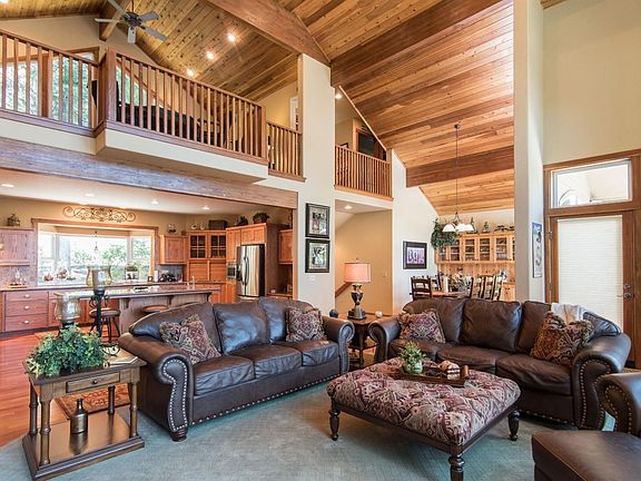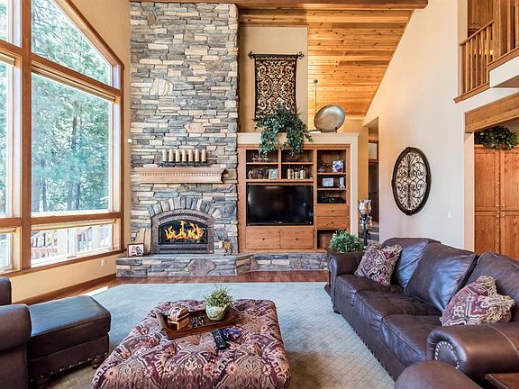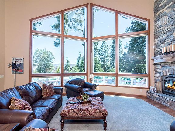 This custom-built home offers the warmth, quality and tasteful accommodations of true mountain luxury, with all the modern finish and amenities you'd expect from a residence of its kind. Interior space offers wonderful proportions radiating out from the towering great room with expansive windows looking toward Blue Canyon and the high snow capped Sierras. On the main level there's a stone fireplace, beautiful hardwood flooring, gourmet kitchen, and an intimate Master suite. Head upstairs to the additional 2 guest bedroom/bathrooms and second family room/loft, that perfectly compliments the main living area and could easily serve as a fourth sleeping space. You'll enjoy the magnificent mountains from multiple decks and nights under the stars around your built-in custom stone fire pit. Hands down one of Shaver Lake's finest luxury homes...make your appointment to view it today!