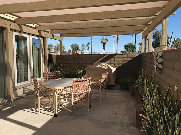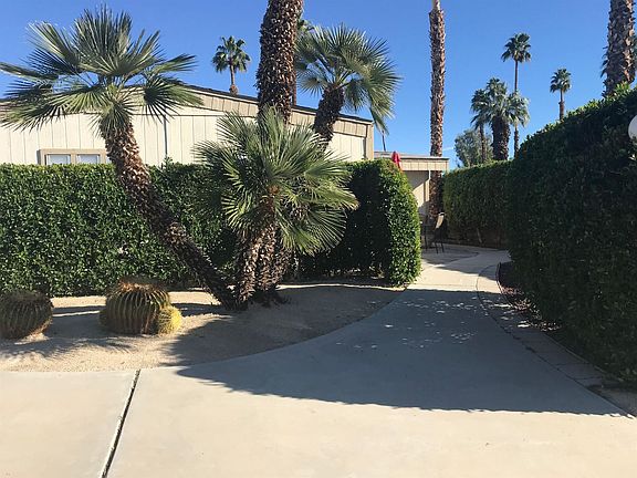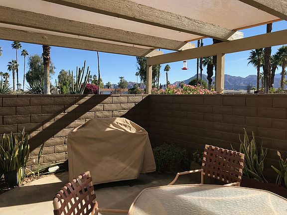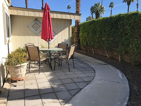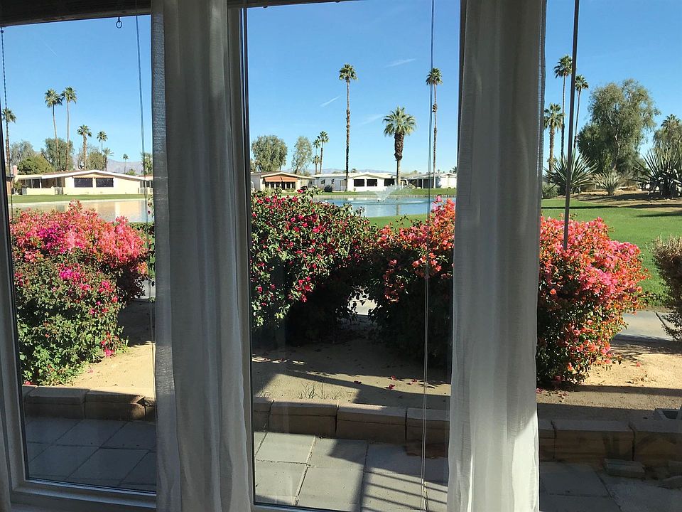 This is it! On the golf course with a gorgeous view of the mountains and pond. A short walk to the clubhouse and all the fun activities. Turnkey furnished including golf cart, freshly painted, new windows, AC / furnace replaced in 2018 ~ just move in and start enjoying life. Private patio ( pet friendly ) with mountain views plus another patio area to enjoy even more mt views! Large main bedroom with walk-in closet and large bath. Kitchen window looks out to the mountains ~ you are surrounded by views. This is a very inviting and cheerful house whether you like to entertain or simply enjoy the views. You own the land and the HOA's are only $358 which includes cable, wifi, trash, pools/spas, tennis, pickle ball, bocce ball, fitness center, dog park, RV parking ($45 a month) and best of all FREE golf on the 18 hole executive course. This is a great vacation or retirement home fully furnished and move-in ready. Portola CC is in the center of the Coachella Valley and very close to El Paseo shopping / dining and McCallum Theater. What more could you want Portola CC is a friendly community and it shows. Buyer to verify all information.