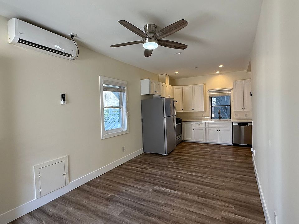 Large windowsElegant tile bathroomsStainless steel appliancesOriginal hardwood floorsHorizontal blindsBright white-cabinet kitchenCeiling fans