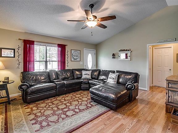 One owner home with 4 BR, 2.5 BA. New carpet in 2 BR's, Fenced back yard with 12 x 16 wired bldg. All S/S kitchen appliances remaining. Tile in MBA, with Shower. HP updated in 2006 when addition of BR #4, half bath and Den was added. New ceiling fans and fixtures. LVT flooring in hall bath. Arched ceilings. Water heater 6 years old. USDA Eligible. Rocking chair front porch.