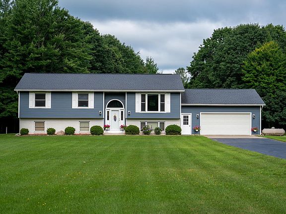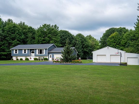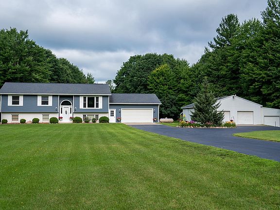 Step into this meticulous home ready for you to move right in! This 5 bedroom, 2 bath home has been completely updated throughout. Walk into the beautiful tile floor foyer and choose to relax up or down stairs in either living/family room. Enter through the 2 car garage area and step into the beautiful kitchen with new flooring, granite countertops, newer appliances, and a slider to walk out on the composite decking overlooking the 5 acres of private property. Continue down the hall for 3 bedrooms and full bathroom that features double sinks and granite countertops. Enjoy the large primary bedroom or step outside onto the covered deck and soak in the hot tub! Move downstairs and cozy up in the family area while you soak in extra heat from the pellet stove. This area includes 2 more bedrooms perfect for extra family space, work out room or office. There is also another full bathroom and giant space for laundry, utilities, and so much storage space. There is even more! This home has ALL the extras including: 30 X 40 outbuilding with closed in lean-to, dog kennel, invisible fencing, generator, geothermal heating/cooling system, paved driveway, beautiful landscaping, custom woodwork, security system and 2 car garage with concrete flooring and access into home on both levels and back yard area.