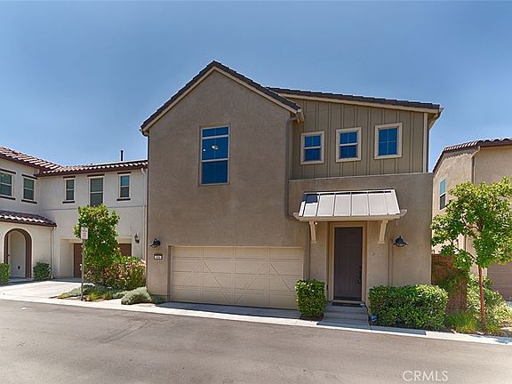 Welcome to Nova at Bedford Canyon. Located on a premium lot with no homes directly behind it, this Woodside home has a view of the hills, especially from the Primary Bedroom! A beautiful entry hall leads to the great room (living, kitchen & dining areas). The 9 ft ceilings & large wall of UV tinted windows in the living area let in plenty of natural light. A ceiling fan, recessed lighting & custom shades complete the room. The kitchen features a large island with seating, beautiful "Alto" stained Maple cabinets, Quartz counters, stainless steel GE appliances & large single-sink with stone-finish. Recessed lighting, large pendants over the island & a beautiful statement light in the dining area complete this modern look. This great room makes everyday living enjoyable & has direct access to the backyard. This yard is virtually maintenance-free with artificial grass & a large patio. You'll love the deeper lot for its privacy (no buildings looking into your yard). Also for convenience, there is direct access to the garage from the kitchen & the side yard. A 1/2 bath completes the downstairs. The stairway at the entry has a coat closet, then leads to the upper level & the large loft. This space is perfect for an office or play area & will adapt to your changing needs. A laundry room is conveniently located upstairs across from the hall bath shared by 2 secondary bedrooms. This bathroom also has Alto-stained Maple cabinets, dual sinks featuring stylish, black fixtures & tile floors for a modern look. The bedroom to your left features a 10 ft ceiling & large closet. Across the hall is another secondary bedroom, decorated beautifully. The primary suite has the best view in the house via the wall of windows. Tile floors complement the private bathroom with dual sinks, separate linen cabinets & shower. A walk-in closet completes the space. All bedrooms have ceiling fans, recessed lighting & carpeting for comfort. A whole house water filtration system & a separate system under the sink are included. The house is wired for CAT 6 & a security system. Solar panels are leased at $/month. The HOA amenities at Hudson House & The Shed (pools, spa, parks, children's pool, lawn games, fitness studio, dog spa & plenty of areas to relax or meet new friends).