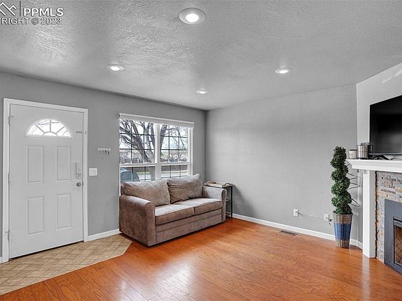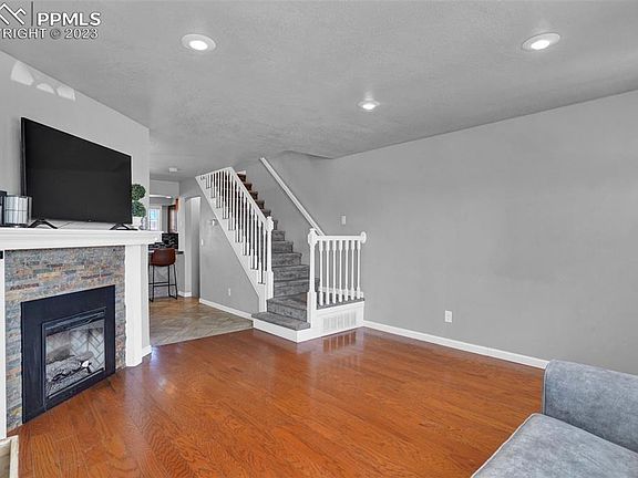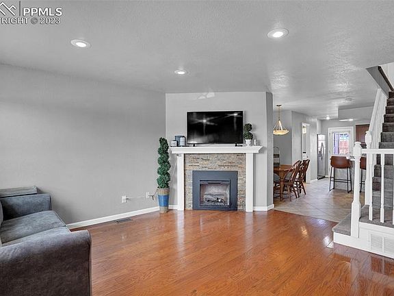 Quaint, well maintained, centrally located, townhome ready for new owners! Step into the main living area featuring stunning wood floors and open concept living space. Take in the stunning gas fireplace that is the focal point of the living room. Head into the stunningly updated kitchen in the rear of the home is complete with tiled counters, tile flooring, stainless steel appliances, ample cabinet space, and recessed lighting. A half bath completes the main level. Head outside to the private outdoor patio space which is a perfect private oasis. Walk upstairs to the spacious master suite which boasts dual closets and an attached bath, complete with jetted tub. An additional bedroom can also be found upstairs. As a cherry on top, the finished basement features 2 additional bedrooms, an additional bathroom, laundry area. All the space you need and more in this home! As an end unit, you are granted the quiet and privacy you crave, and it also backs to an open space common area. Located near all the shopping and dining you need, plus easy access to the highway, and close to Fort Carson; this is one you won't want to miss!