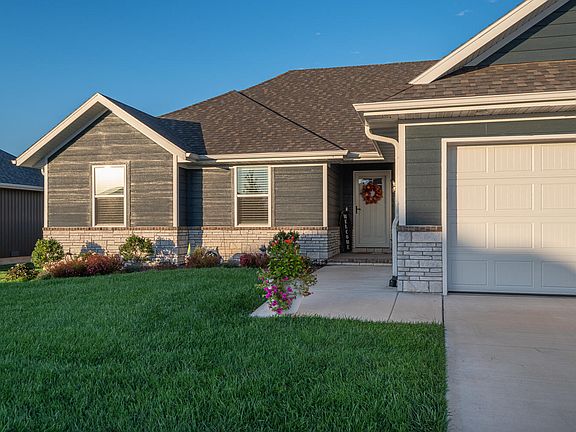 4244 Siena Ave, Ozark, MO 65721. Prepare to be impressed with this new home in Olde World Estates. It has been meticulously cared for by the current owners. It features 4 bedrooms, 2 full baths, a 3 car garage, and 1824 square feet of open living space. The living room, kitchen, and dining area are in an open floor plan. The living room has a vaulted ceiling and a gas-log fireplace. The kitchen has quartz countertops, a walk-in pantry, a bar counter, and ample cabinet space. All appliances, including the side-by-side refrigerator, gas oven range, and built-in microwave oven stay with the sale. Also, the washer and dryer are included. The large master bedroom has a tray ceiling and a large private bath with double vanities, a walk-in shower, and an oversized walk-in closet with built-in shelving and a chest with a granite top. Both bathrooms and the master closet have granite countertops. The backyard features a covered patio and is privacy-fenced. The beautiful landscape sets the curb appeal apart and is maintained with an in-ground sprinkler system in the front and back. Make plans to view this lovely home soon before it is too late.