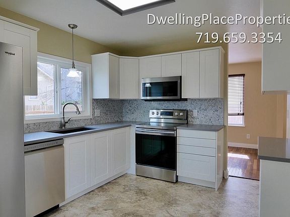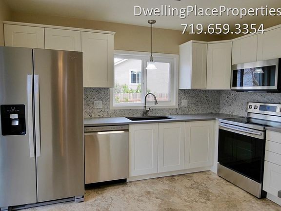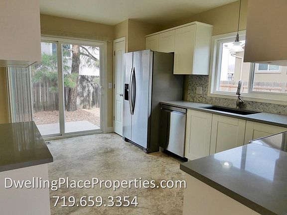 This is a beautifully maintained, exceptionally clean and bright home located in School District 20 near the Powers corridor in zip code 80920. With a newly remodeled kitchen, including all-new stainless appliances, new cabinets with convenient built-ins, and quartz countertops, this is a 3-bedroom, 2.5 bath with an oversize single car garage, washer / dryer hookups, window coverings, hardwood walnut floor in the main living area. The kitchen has direct access to the patio and contains a smooth-top electric stove, refrigerator, microwave, dishwasher, and pantry. It has a spacious, vaulted master bedroom and large master bathroom. The patio and fenced back yard are a great place for entertaining, children, and a pet. It features central air conditioning, a programmable thermostat and dual-pane windows for energy efficiency. This home is convenient to both hospitals, Peterson AFB, and a short commute to the Air Force Academy, close to Frontier and Academy Endeavour Elementary School. Located within a couple of miles of abundant shopping, King Soopers, theaters, over 30 restaurants, Lowes, Super Target, Walmart, Home Depot, etc. Please request to see this property through the form on this web page or text only. No calls, please. Dogs larger than 25 pounds will be handled on a case-by-case basis. Pets are allowed with a refundable deposit and non-refundable fee. A background check is part of the screening process. No smoking, no marijuana.