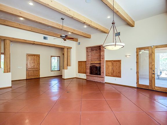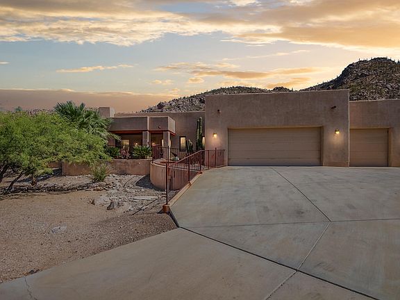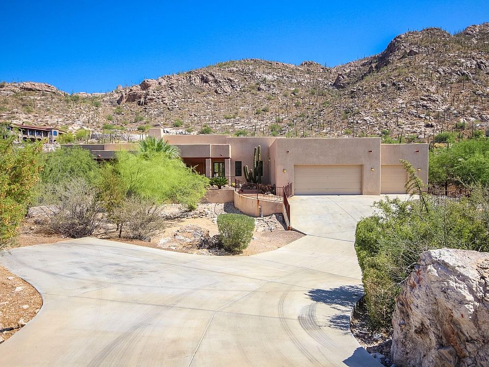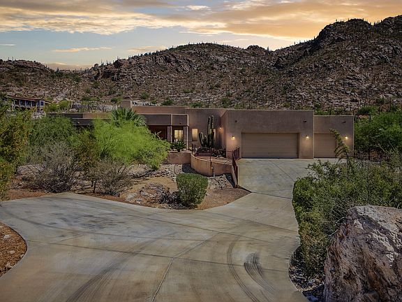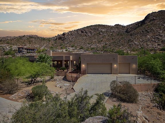 Carve out an incredible life in this fantastic single story home that is nestled in the hills of Tucson! Upon entering this home, you are greeted with gorgeous exposed wooden beams, a cozy stone fireplace and an open floor concept! Granite countertops, prep sink, breakfast bar, black appliances, 2 wall ovens, tiled backsplash, sleek finishes/fixtures and beautiful pine wood cabinetry. The spacious bedrooms offer plenty of room for sleep, study and storage. The resort style master bathroom showcases a garden style bathtub w/jets, dual sinks, walkin shower and an expansive walkin closet. The backyard is truly a natural desert oasis that is comprised of an exterior fireplace & panoramic mountain views! Don't wait! This stunning dream home awaits!