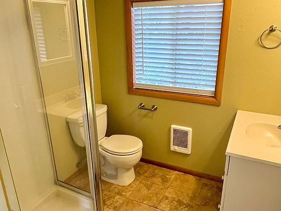 - Cute bathroom with linoleum flooring, large shower with glass doors